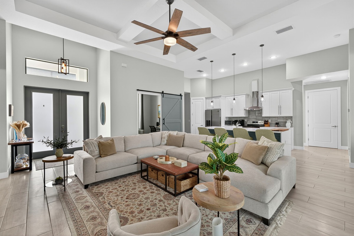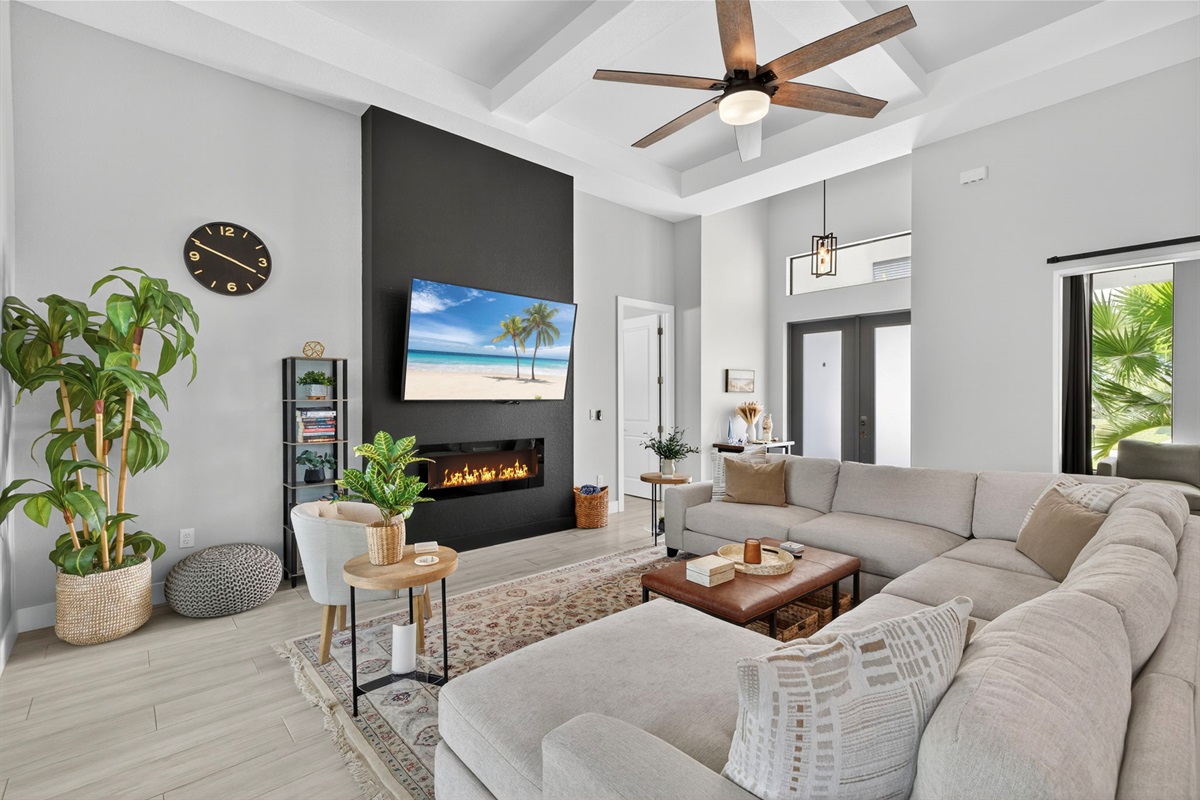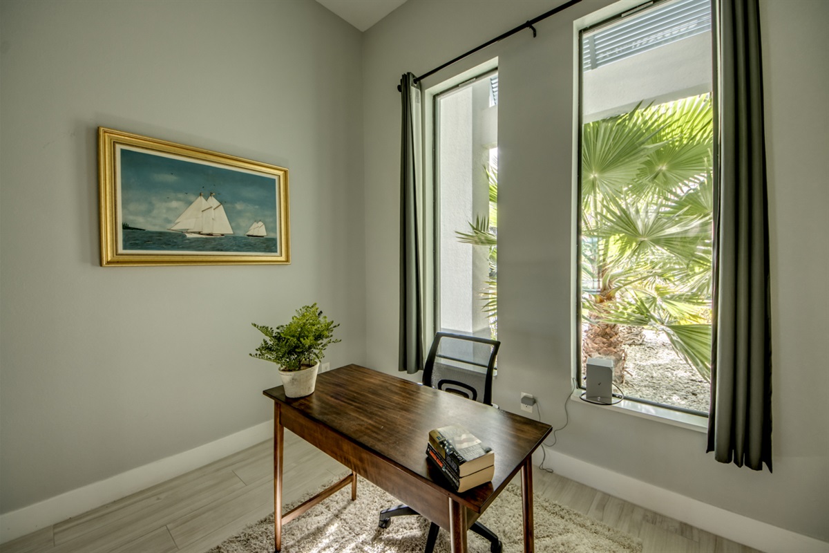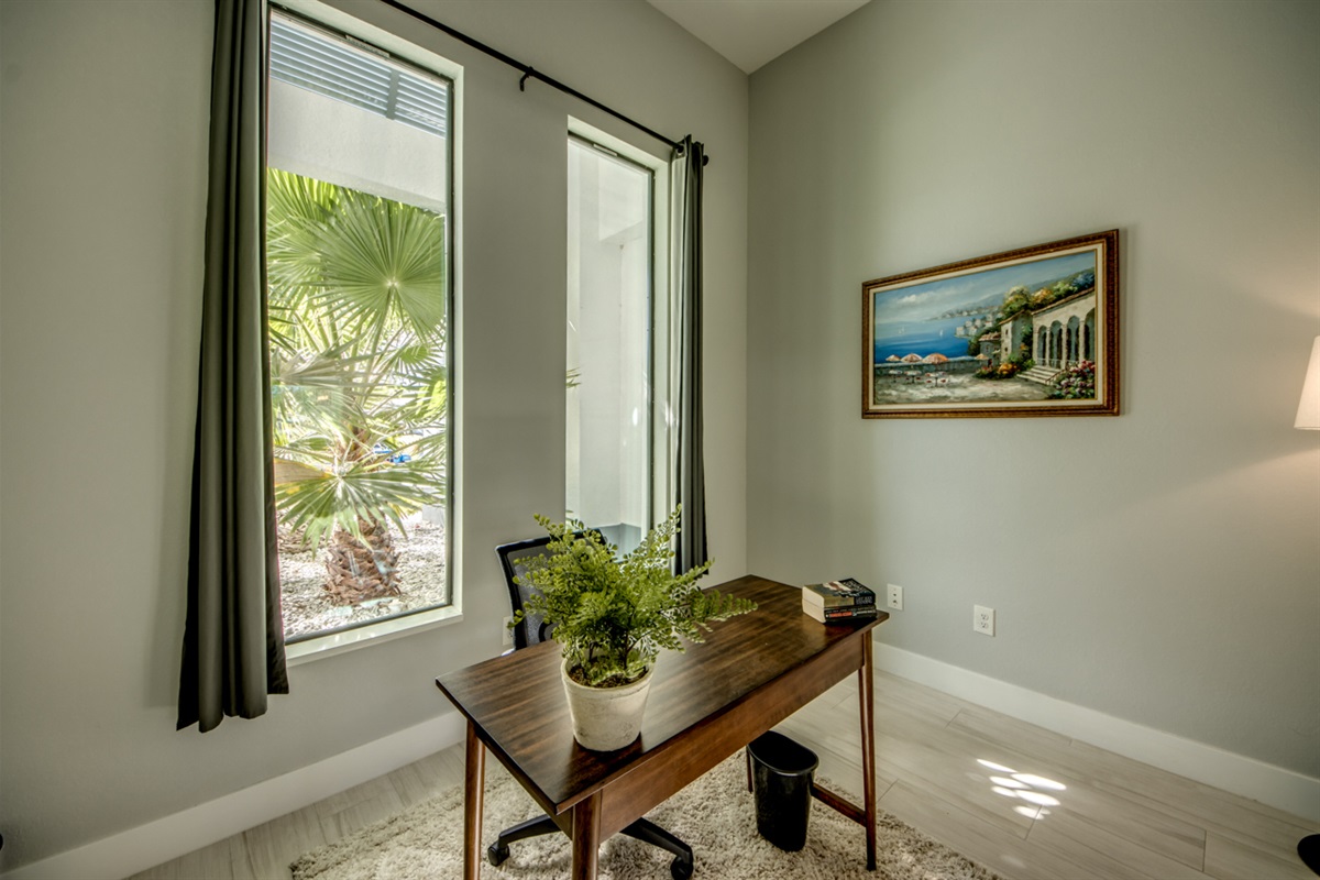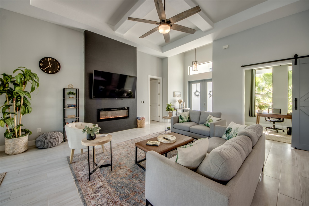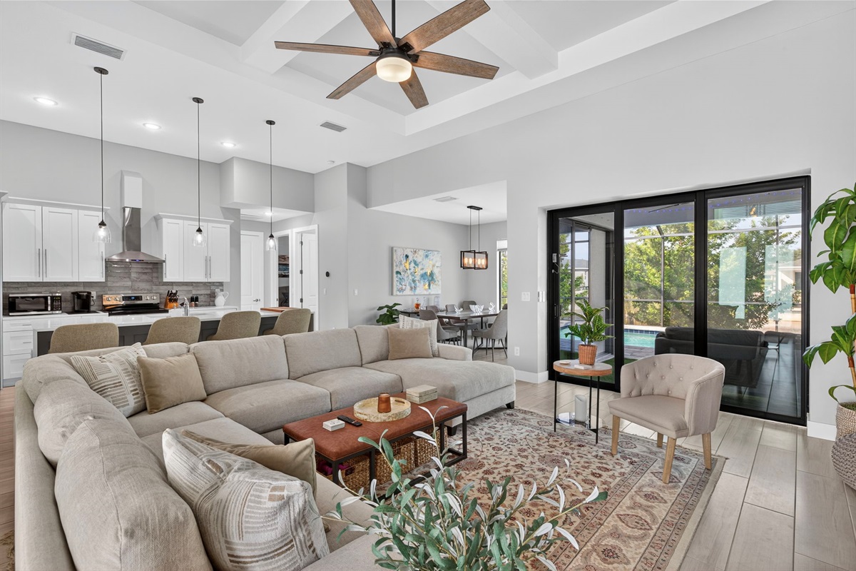 Open concept great room with an office/den that shares expansive views of the living area, pool