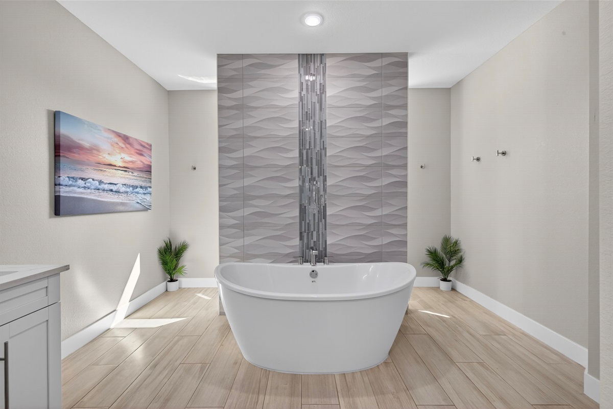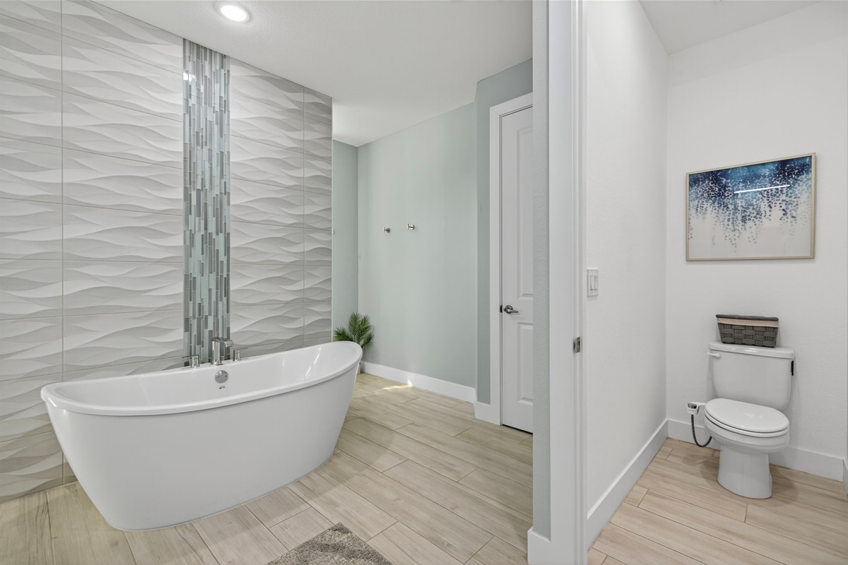 private access to the pool area and a large en suite bathroom with a slipper style soaking tub, dual