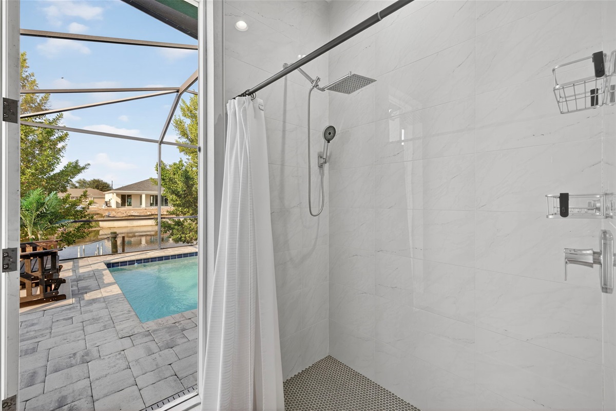 privacy with a shared bathroom which leads out to the heated pool with an outdoor shower. Just